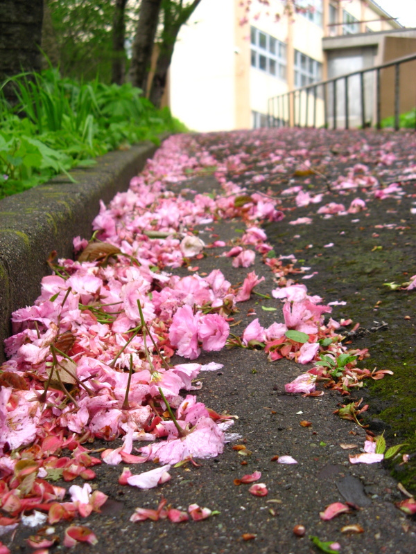 当日、あせって車を走らせると、やっぱり・・・下一面ピンクの花びらが。