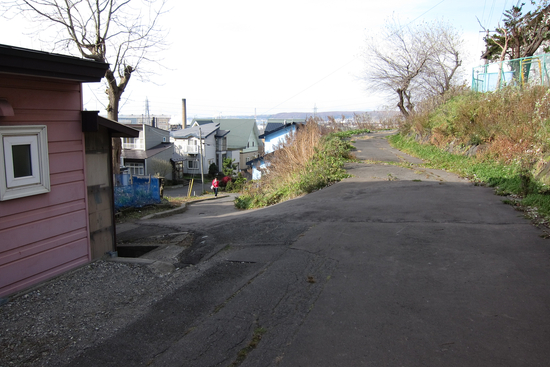 元の道から右に折れ下へと向かってますが、この辺もすっかり住宅街となってしまってますね。 でも、このゆるやかな坂は、なんとなく懐かしい感じがします 奥の方に広場があってよくそこで遊んだ記憶があるんですよね~(笑