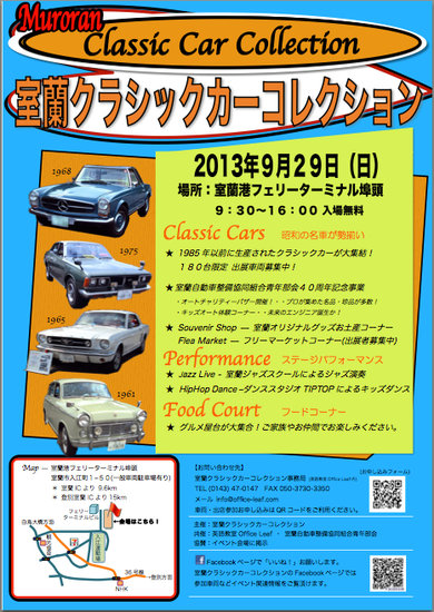 今週の日曜日(9月29日) 室蘭港フェリーターミナル埠頭で1985年以前に生産されたクラシックカーが大集結する模様 フードコーナーもあるようなので、ご家族揃って出かけてみてはいかがでしょうか。 時間は9:30~16:00、入場無料です。 これは行くしかありませんよね~~!o(^^o)(o^^)oワクワク お天気になりますように (-m-)” パンパン