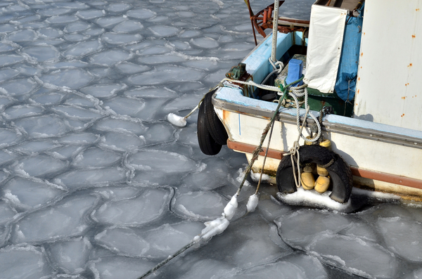 この日、撮ったお気に入りの1枚。手前の船と葉氷に光があたって、きれいだな~と思いながらパチリ(笑