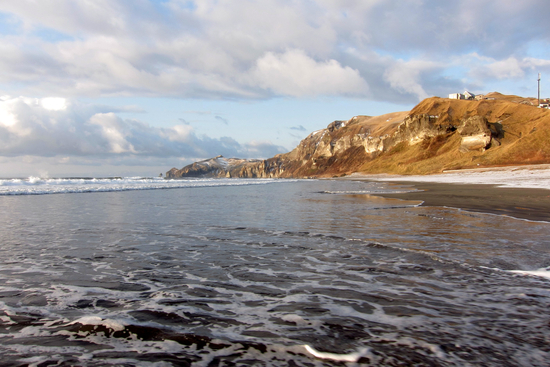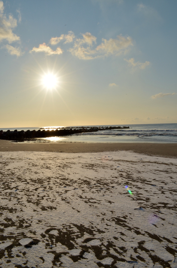 今朝方降ったのでしょうか。浜辺には雪が・・・・。最近、運動不足だし、奥の方まで歩いてみようかな~