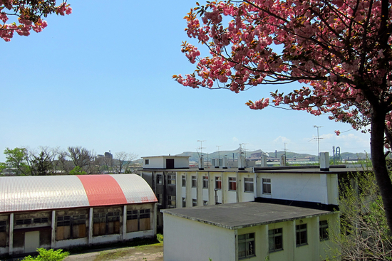 閉校した日新小学校上まで歩いてきました。ここもベニヤ板がはられてる・・・・。