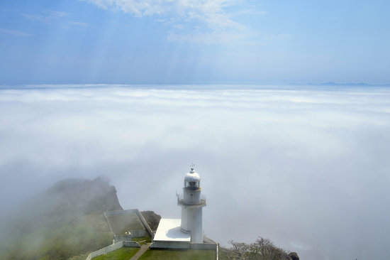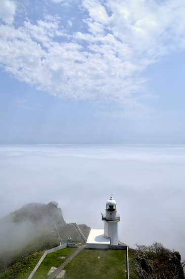 この間の日曜日。 輪西駅でSLを撮り終えた後、ふと遠くの山を見ると霧が流れているのが見えたので 慌てて地球岬に行くと私の大好きな景色が広がっていました♪ 風が強く灯台が霧で見え隠れする中、灯台が現れたとこをパチリ。