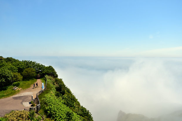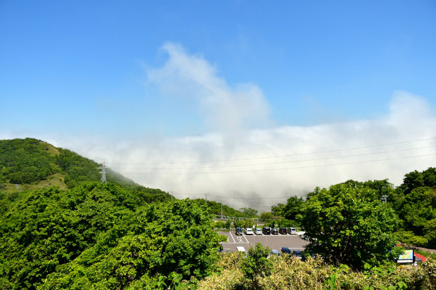 展望台へと上がり振り返ると、遠くに霧のかたまりが見えました。