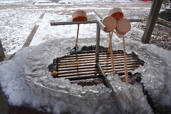 年末からの強風と寒さのため手水舎には氷が・・・うー寒いー。