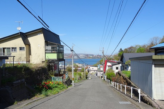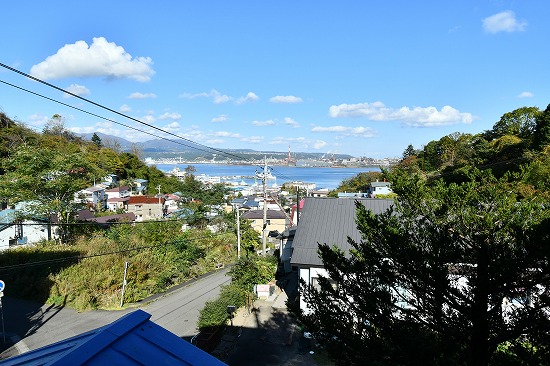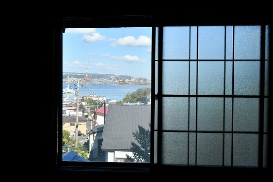 2階から見える室蘭の町並みと、遠くに見える海