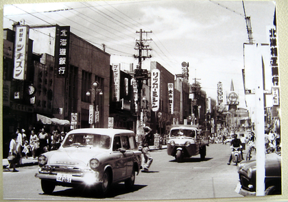 室蘭支店や金市館、丸井今井などの看板が見える。写真中央を走っているのは、