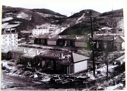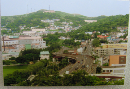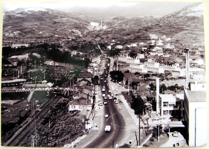 「室蘭新道建設前の母恋の街並み。写真中央の丘上に見える白い建物は