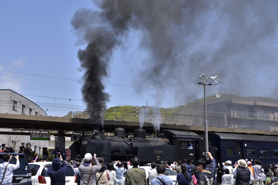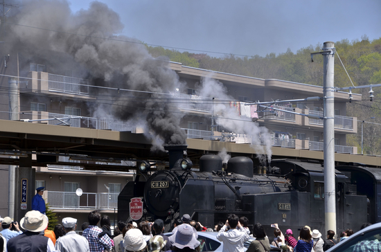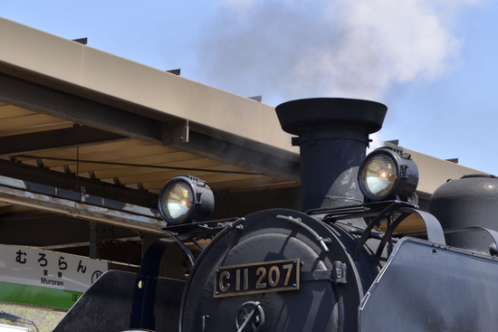 室蘭駅を出発する間際、SLが黒煙を吹いた時、歓声があがりました。