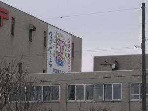 東室蘭郵便局の上方に、ぶたさんが焼き鳥を持っている看板が飾られています。